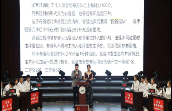 本次竞赛由8支代表队32名选手参加,分为必答题、抢答题、观众互动、风险题四个环节。参赛选手反应迅速,冷静应战,思维敏捷,对答如流。比分不断跳动攀升,选手摩拳擦掌,斗志昂扬,赛场热情洋溢,群情振奋。团队抢答环节紧张激烈,选手们以饱满的精神状态和扎实的理论功底沉着应战,赢来现场观众阵阵掌声,展现出积极向上和奋发有为的精神风貌。