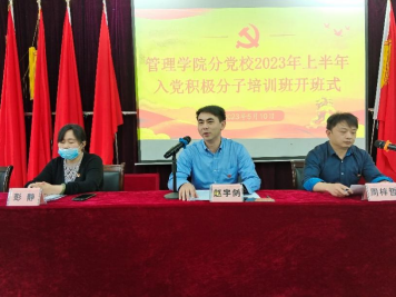 开班式上,党委书记赵宇剑作动员讲话。他首先代表学院党委对本次培训班的顺利开班表示祝贺,对加入培训班的新一批入党积极分子表示欢迎。他指出,入党积极分子培训班具有极其重要的意义,学院党委高度重视,根据实际情况对培训方案作了精心安排,培训班学习是同学们难得的机会,希望同学们在此次集中学习后能更加坚定向党组织靠拢的信念。他强调,入党不是一个阶段的事情,而是一辈子的事情,希望同学们能够脚踏实地、严格要求自己、坚定理想信念。美好生活来之不易,要忆苦思甜,珍惜当下。结合这次培训班的目标与要求,赵宇剑书记对培训班学员提出了三点要求:一是要端正自己的学习态度,正确认识此次培训的目的;二是要更加熟悉掌握党的基本知识和基本理论,端正自己的入党动机,注重学习,在生活和工作中坚定地向党组织靠拢;三是明确自己的目标和党员的义务,树立好伟大理想。希望大家在此次培训中真正做到学有所思、学有所得、学有所成。最后,他预祝本次培训班能够圆满成功,希望同学们通过自身的努力积极地向党组织靠拢。