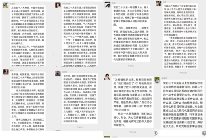 习近平总书记在大会上深刻总结了党过去五年的工作和新时代十年的伟大变革,五年来,我们党团结带领人民,攻克了许多长期没有解决的难题,办成了许多长期没有解决的大事要事,推动党和国家事业取得了举世瞩目的重大成就。十年来,党和国家事业取得历史性成就、发生历史性变革,推动我国迈上全面建设社会主义现代化国家新征程。同学们牢记习近平总书记重要讲话,认真思考,在直播结束后心潮澎湃,纷纷在线上发表心得感悟,并自发将二十大报告推文分享至朋友圈。