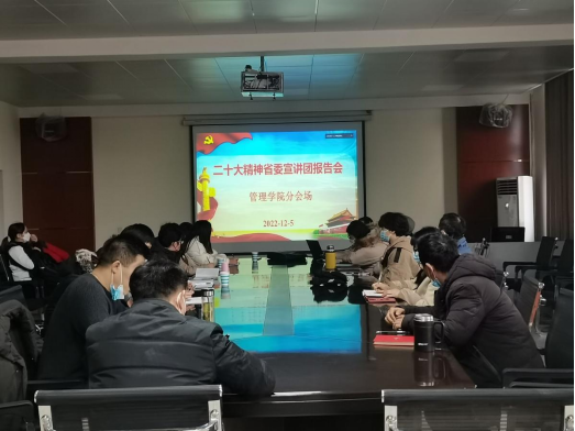 125日上午学习贯彻党的二十大精神宣讲报告会在九江学院大礼堂举行,省委宣讲团成员、江西省发展和改革委员会党组书记、主任张和平同志作宣讲报告,管理学院积极组织分会场,学院党政领导班子成员、各科室负责人、学生党支部书记参会