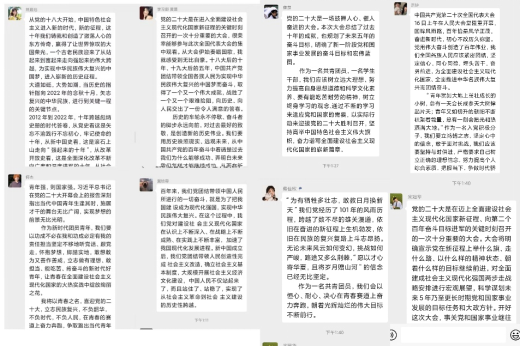 习近平总书记的报告深入人心,带领同学们回顾历史,展望未来,激励同学们坚定理想信念、不畏困难、直面挑战,在全面建设社会主义现代化国家新征程中不忘初心、砥砺前行。同学们牢记习近平总书记重要讲话,认真思考,在直播结束后心潮澎湃,纷纷在线上发表心得感悟,并自发将二十大报告推文分享至朋友圈。