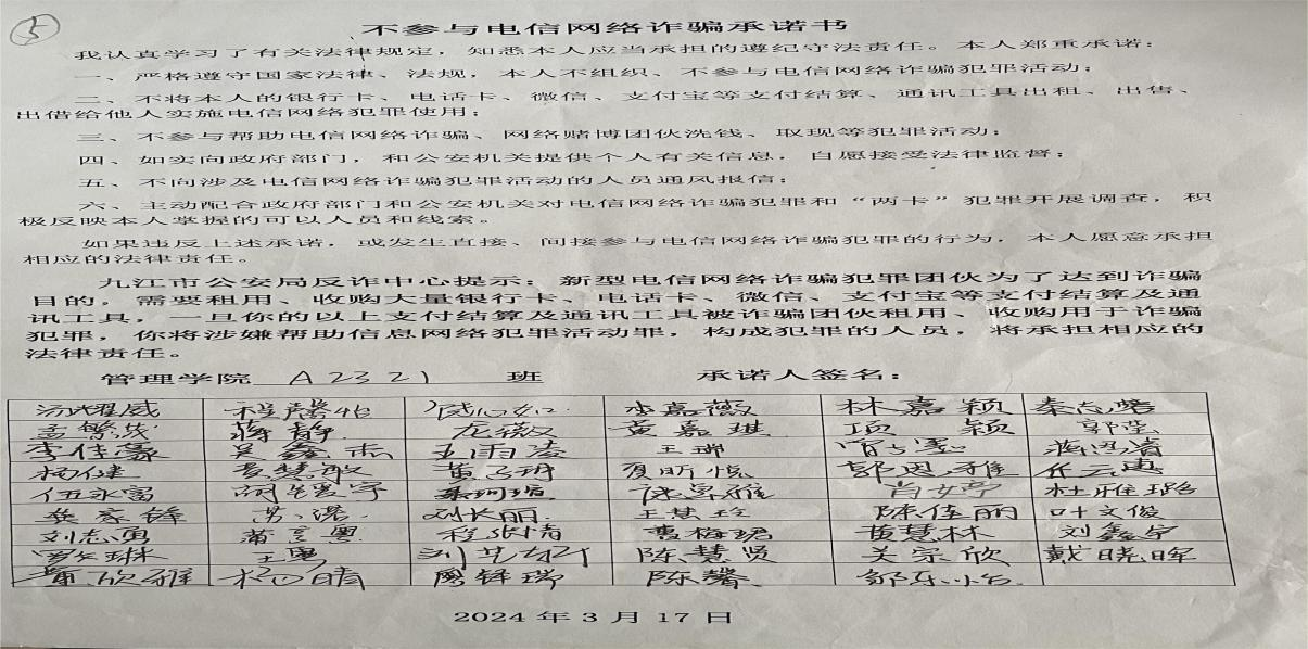 组织签订《不参与电信网络诈骗承诺书》。学院组织各班发放了《不参与电信网络诈骗承诺书》,要求每位学生承诺不参与出售、出租、出借银行卡、手机卡、微信QQ 号、支付宝等通讯金融设备帐号,不参与电信网络诈骗违法犯罪活动。同学们积极响应,认真阅读并纷纷在《不参与电信网络诈骗承诺书》上郑重的签下了自己的名字,承诺不组织、不参与电信网络诈骗犯罪活动。