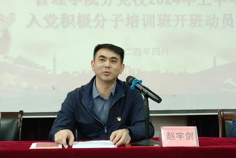 动员会上,党委书记赵宇剑作动员讲话。他首先代表学院党委对本期培训班的顺利开班表示祝贺,对新一期培训学员的到来表示热烈欢迎。他指出,参加培训班是每一个要求进步的学员的必修课,也是大家接受党组织系统教育培训的开端,学员们要珍惜此次学习机会,向党组织靠拢,积极要求进步。针对此次培训,赵宇剑书记对全体学员提出了三点期望:一是要端正态度,正确认识参加入党积极分子培训班的重要意义,打牢思想基础;二是要明确目标,努力提高培训的学习效果,把积极向党组织靠拢落到实际行动当中;三是要严格要求,圆满完成本次培训的学习任务,展现出热情洋溢的精神风貌。随后,作为开班第一课,党委书记赵宇剑为学员们作了“学习贯彻习近平总书记关于党的自我革命的重要思想——保持清醒坚定 扣好人生扣子”的专题辅导。他围绕《中国共产党章程》《中国共产党纪律处分条例》所体现的党的建设、党的自我革命的重要思想作了重点讲授。当前正值党纪学习教育,他教育学员要学好用好党章党规党纪,做到学纪、明纪、守纪,把遵规守纪刻印在心,争做堪当民族复兴重任的时代新人,在实现中华民族伟大复兴的时代洪流中踔厉奋发、勇毅前行。
