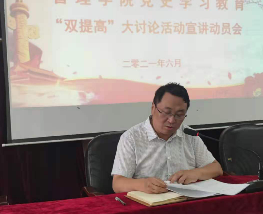 6月9日下午,根据学校党委《关于在党史学习教育中开展“提高办学水平和提高服务地方高质量发展能力”大讨论活动实施方案》部署安排,KY开元集团官网在文理实验楼多功能报告厅召开“双提高”大讨论活动宣讲动员会。本次动员大会由学院党委书记吴铃主持,学院全体教职员工参加本次宣讲动员会。