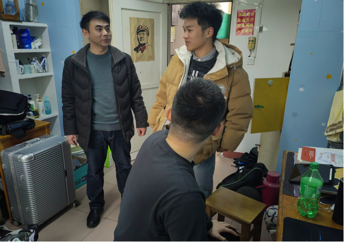 每到一个宿舍,老师们都会与学生交谈并询问学生到校情况以及新学期准备情况,并对宿舍的安全隐患逐一排查,仔细查看有无物件不全和安全用电等情况,检查中,重点查看了学生寝室消防设备设施完备情况、安全出口及疏散通道是否符合要求、寝室是否有乱接乱拉电源线、寝室是否存在违规使用大功率电器或其他易燃易爆物品等情况,并现场协调解决隐患。赵宇剑向同学们致以新年的问候并提醒同学们要做好新学期开学第一周考试的准备,注意调整作息时间,叮嘱大家继续做好疫情防控、自己是健康第一责任人,鼓励同学们以饱满的热情投入到新学期的学习中。