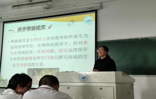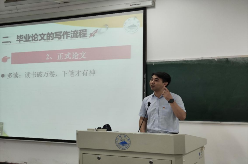 校优秀论文指导老师刘静老师作毕业论文撰写专题讲座。她从毕业论文进度安排、论文选题、论文结构、撰写要求、学术规范以及评审答辩过程等方面进行了详细的讲解。