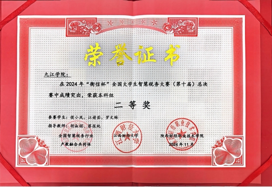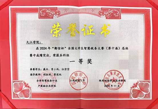 在总决赛中,卓越会计班A2226班戴怡、伍莹莹、审计学A2331班曾小鸿组成的九江学院二队凭借深厚的专业积累、熟练的实务操作以及默契的团队协作,荣获本科组一等奖;卓越会计班A2226班侯小凤、江婧茹、罗文琳组成的九江学院一队斩获本科组二等奖,为学院争得了荣誉。