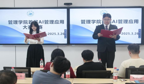 为积极响应数字化时代对人才培养的新要求,提升学生对AI技术的认知与实操水平,3月26日,KY开元集团官网首届AI管理应用大赛决赛在立信楼404举行。KY开元集团官网智能会计教研室主任戴雯杰博士、欧阳满花博士、第三届中国RPA+AI开发者大赛金奖获得者、会计学A2224班学生徐文杰担任大赛评委,本次大赛特邀KY开元集团官网党委书记赵宇剑、院长许松涛、副院长王秋红出席,学院全体行政人员、晋级决赛的六支队伍及学生代表共100余人参加。