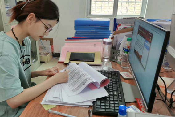 社区是疫情防控的最后一道防线,也是落实联防联控、群防群控的关键。每天早晨五点天刚刚亮的时候,陈紫怡便已到达社区换好防护服,开启一天的工作。在炎炎烈日下,拿着扩音器在每栋楼下提醒小区里的居民做核酸检测;在小区内张贴有关疫情防控的宣传标语;在核酸检测点检查居民的身份信息、健康码;在核酸检测过程中维持秩序,确保不出任何纰漏。连续一周的疫情防疫工作,她从不曾犹豫退缩,始终在基层防疫一线践行着我们大学生的责任担当。