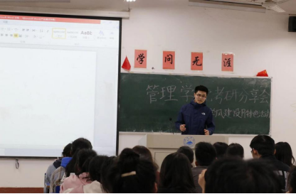 来自市场营销A1913班已被广西大学资源利用与植物保护专业拟录取的冷海涛同学,结合自身跨专业考研的经历,深入细致地分享了他的备考过程,建议同学们结合自身情况理性选择报考学校,全身心投入考研,坚定信心、不悔前行,他风趣的语言,清晰的条理,开门见山的风格赢得了在座同学们热烈的掌声。