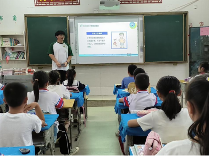 溺水警钟常响,安全谨记心头。正值暑假期间,天气炎热,溺水事故常有发生,为贯彻落实江西省长叶建春在江西农业大学形式报告会暨专题党课上对中小学生防溺水教育工作重要指示精神,加强对乡村中小学生防溺水教育,拧紧乡村振兴“安全阀”,筑牢防溺水警戒线。实践队在海会镇中心小学开展防溺水主题教育活动,通过课堂宣讲形式结合趣味手势舞表演,向同学们生动地讲解有关防溺水常识、游泳注意事项、落水自救方法等相关知识,队员们还为同学们送上防溺水主题教育贴纸,寓教于乐的同时更是推动了活动走向高潮,形象可爱的卡通贴画被同学们贴在常用书本上,防溺水知识被同学们谨记心中。
