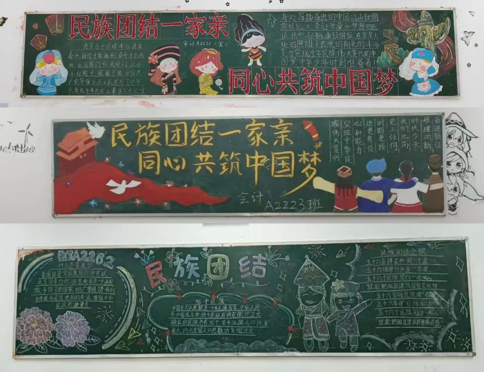 各班级在绘制“民族团结一家亲,同心共筑中国梦”主题黑板报的同时,还组织召开了主题团日活动。同学们围绕“民族团结一家亲,同心共筑中国梦”主题展踊跃发言,大家纷纷表示:作为当代大学生,要进一步提高思想认识,把铸牢中华民族共同体意识贯穿到学习生活全过程,加强政治理论、传统文化和专业知识本领的学习,锻造过硬本领,提升综合能力,踔厉奋发、不负韶华,让青春在为祖国为人民的奉献中绽放出更加绚丽的光彩。