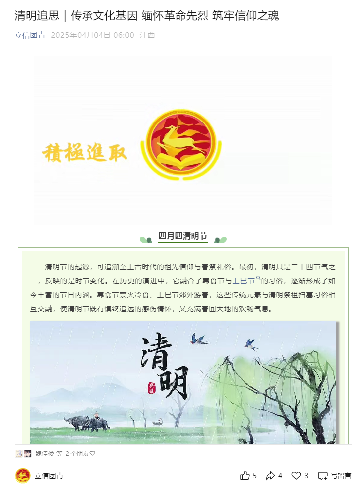 清明节期间,KY开元集团官网打造宣传矩阵,线上通过立信团青微信公众号发布《清明追思|传承文化基因缅怀革命先烈筑牢信仰之魂》推文,科普清明节起源、习俗,分享祭扫注意事项;线下组织学生创作清明节主题黑板报,从清明时节祭扫祖先、寄托哀思的场景,到“清明时节雨纷纷,路上行人欲断魂”的千古名句,再到介子推与寒食节的历史典故,丰富的内容让黑板报兼具文化性与趣味性,营造清明节日浓厚氛围。