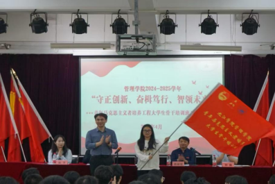 开班仪式在激昂的团歌《光荣啊,中国共青团》中正式启幕。赵宇剑书记作动员讲话并为青马班授旗,对本届青马班的开班表示热烈祝贺,对全体学员提出三点希望:一是强化思想引领,筑牢信仰根基,号召学员勇担时代重任,为实现中国梦夯实思想基础;二是汇聚创新力量,推动团学工作提质增效,鼓励大家突破思维定式,在学业、工作与团队协作中探索新路径、激发新动能,凝聚集体智慧;三是彰显青春担当,勇挑时代重担,学生干部要做好示范作用,以实际行动展现青春活力,努力成为老师信任、同学支持的学生干部。