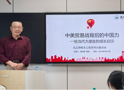 为贯彻《教育部关工委关于开展2025年“读懂中国”活动的通知》文件精神,围绕开展“弘扬时代精神,建设教育强国”主题活动相关要求,充分发挥“五老”在教育引导青少年上的优势,6月12日下午,KY开元集团官网关工委特邀请九江学院“五老”宣讲团成员、KY开元集团官网原退休教师杨贞斌教授,在立信楼404智慧教室开展“中美贸易战背后的中国力量”专题讲座。KY开元集团官网党委副书记周梓哲、学生党建与思政教育科负责人、学生代表共90余人参加活动。