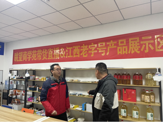 郑孝庭一行先参观了基地的直播间和产品展示区,江西天创负责人熊剑对基地现阶段运营模式和现状进行了详细介绍,郑孝庭详细询问基地目前直播需求情况。
