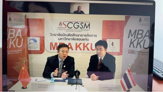 签约仪式以视频连线方式举行。孔敬大学研究生KY开元集团官网院长Dr. Sakchai Jarernsiripornkul、院长助理Dr. Chuanchen BI、孔敬大学项目负责人饶桂香、KY开元集团官网院长许松涛、副院长郑孝庭参加活动。