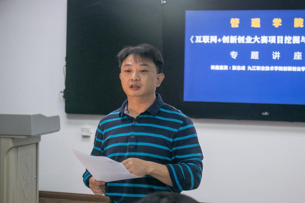 周梓哲在主持讲座中,详细介绍了张志成工作业绩,结合讲座内容向在场师生作了学院“互联网+”大学生创新创业大赛工作的再动员再部署。